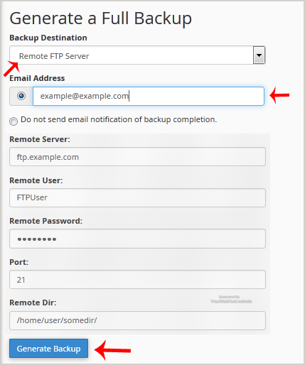 5. Once you fill in the Remote FTP details, click on the "Generate Backup" button.