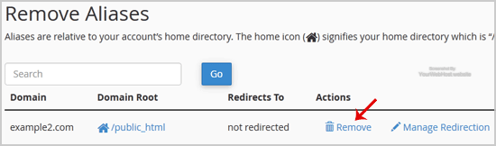 Under "Remove Aliases", locate the parked domain name and click on the "Remove" link.