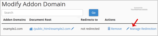 3. Under "Modify Addon Domain", locate the addon domain and click on "Manage Redirection".