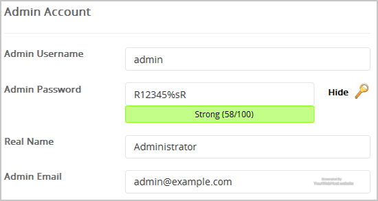 • Admin Username: Your new Xoops username (for security reason do not use the "Administrator" or the "Admin" username.)