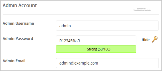- Admin Username: Your new PyroCMS username (for security reason do not use the "Administrator" or the "Admin" username.)